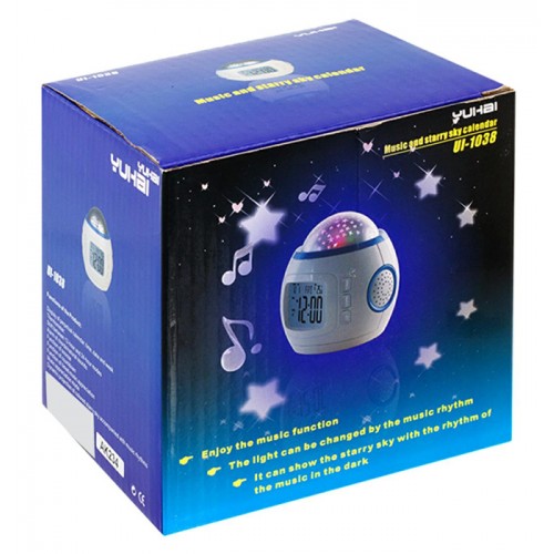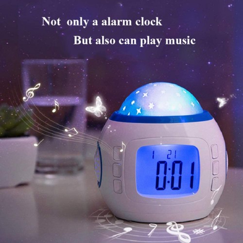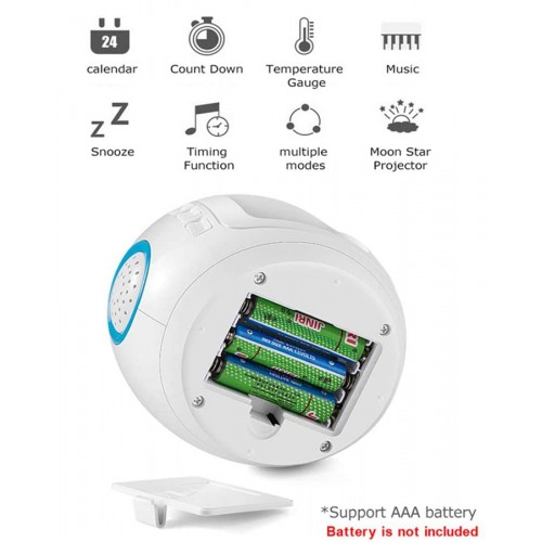 Επιτραπέζιο ρολόι με μουσική και δυνατότητα προβολής αστερίων που αλλάζουν χρώμα ανάλογα με τον ρυθμό της μουσικής. Εξοπλίζεται με οθόνη LCD που δείχνει την ώρα, την ημερομηνία με την ημέρα της εβδομάδας αλλά και την θερμοκρασία. Επιπλέον, διαθέτει ξυπνητήρι και λειτουργία αντίστροφης μέτρησης. Τροφοδοτείται από 3 μπαταρίες AAA(δεν συμπεριλαμβάνονται) και είναι ιδανικό για παιδικά δωμάτια.