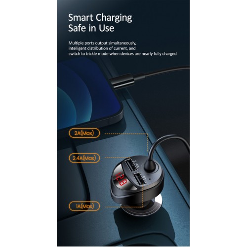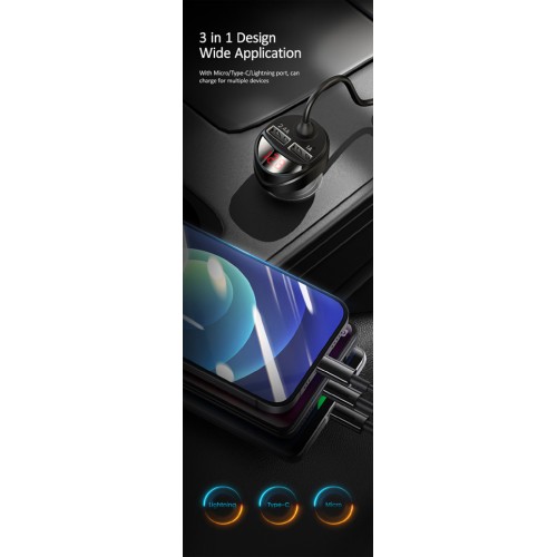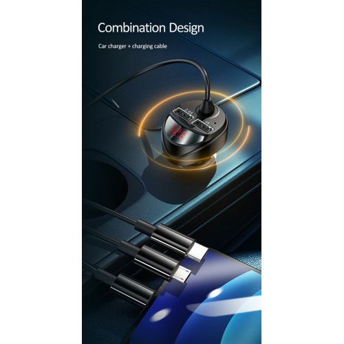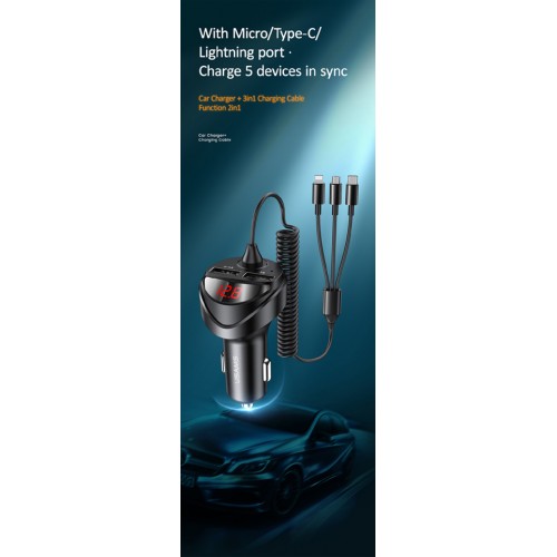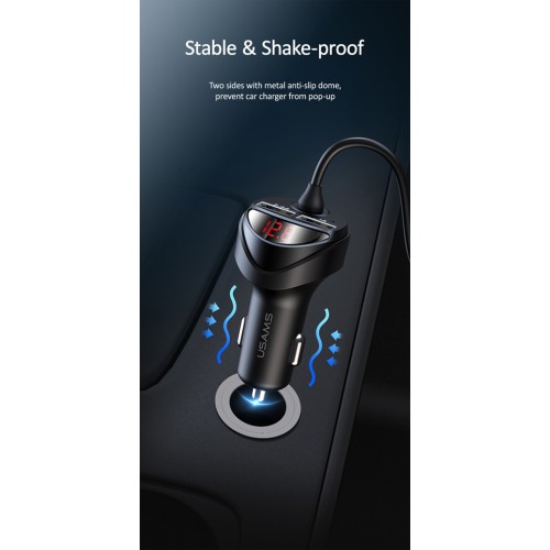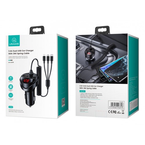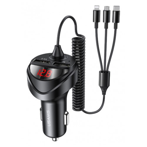 USAMS φορτιστής αυτοκινήτου C22 με καλώδιο 3 σε 1 & οθόνη, 3.4A, μαύρος