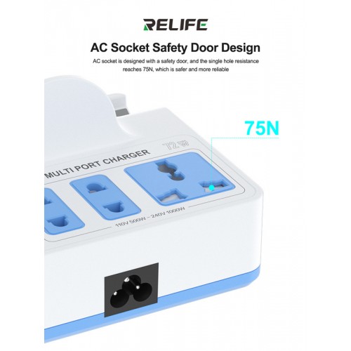 Υψηλής απόδοσης σταθμός φόρτισης της Relife, κατασκευασμένος από ανθεκτικό υλικό και συμβατός με συσκευές που φορτίζουν ασύρματα ή μέσω USB θύρας. Διαθέτει 1x USB και 3x USB-C θύρες εξόδου που υποστηρίζουν φόρτιση με μέγιστη συνολική απόδοση 72W ενώ υποστηρίζει και ασύρματη φόρτιση με απόδοση έως 15W. Επιπλέον, ενσωματώνει 3x υποδοχές πριζών ρεύματος για την σύνδεση συσκευών έως 1000W. Η τροφοδοσία του γίνεται μέσω DC καλωδίου (συμπεριλαμβάνεται), μήκους 1.2m. Σημεία ενδιαφέροντος προϊόντος -4x θύρες φόρτισης με μέγιστη απόδοση 72W -ασύρματη φόρτιση με μέγιστη απόδοση 15W -3x υποδοχές πριζών ρεύματος -ανθεκτική & κομψή κατασκευή για σύνδεση συσκευών έως 1000W -με πολλαπλές προστασίες για ασφαλή φόρτιση Τεχνικά χαρακτηριστικά -είσοδος: AC 100V-240V, 50-60Hz -QC3.0 22.5W-1: 5V/3A, 9V/2A, 12V/1.5A, 3.3-11V/2.2A -PD20W-2: 5V/3A, 9V/2.22A, 12V/1.67A, PPS: 3.3-11V/2A -PD24W-3: 5V/3A, 9V/2.67A, 12V/2A, PPS: 3.3-11V/2.65A -PD45W-4: 5V/3A, 9V/3A, 12V/3A, 15V/3A, 20V/2.25A, PPS: 3.3-16V/3A -PD+QC: 5V/4A max -QC port support: Super fast charging (SCP) -έξοδος ασύρματης φόρτισης: 5-15W -συνολική έξοδος USB: 72W -υλικό: PC + ABS (fireproof) -μήκος καλωδίου τροφοδοσίας: ~1.2m -διαστάσεις: 135x140x95mm -χρώμα: λευκός/μπλε Περιεχόμενα συσκευασίας -σταθμός φόρτισης -καλώδιο τροφοδοσίας -εγχειρίδιο χρήσης