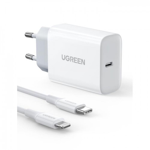 Φορτιστής γρήγορης φόρτισης από τη Ugreen σε λευκό χρώμα με USB-C θύρα πρότυπου PD και καλώδιο lightning. Σχεδιασμένος να παρέχει ασφάλεια και κορυφαία αξιοπιστία.